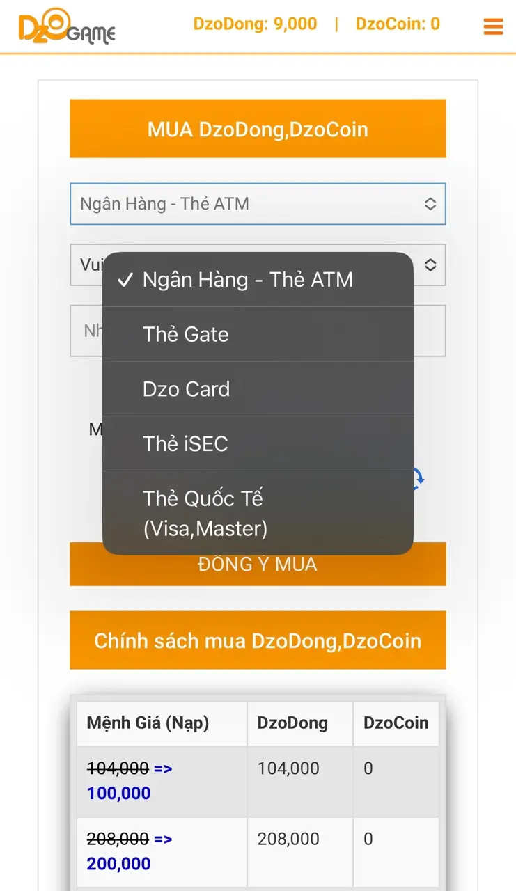 Chọn Phương Thức Nạp (Ngân Hàng - Thẻ ATM, Thẻ Gate, DzoCard, Thẻ iSEC, Thẻ Visa / Master) và mệnh giá nạp. Sau đó xác nhận thanh toán (chi tiết các hình thức nạp xem tại đây)