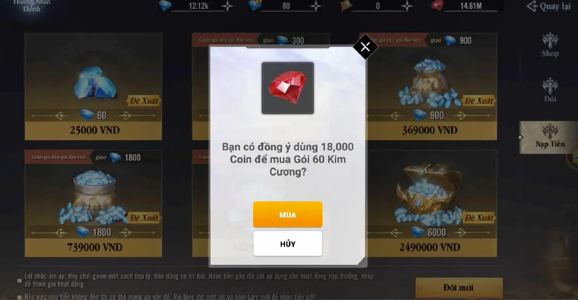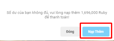 B2: Xác nhận Mua. Vậy là Chiến Thần đã dùng Ruby để mua thành công gói nạp trực tiếp trong game rồi ạ ~~