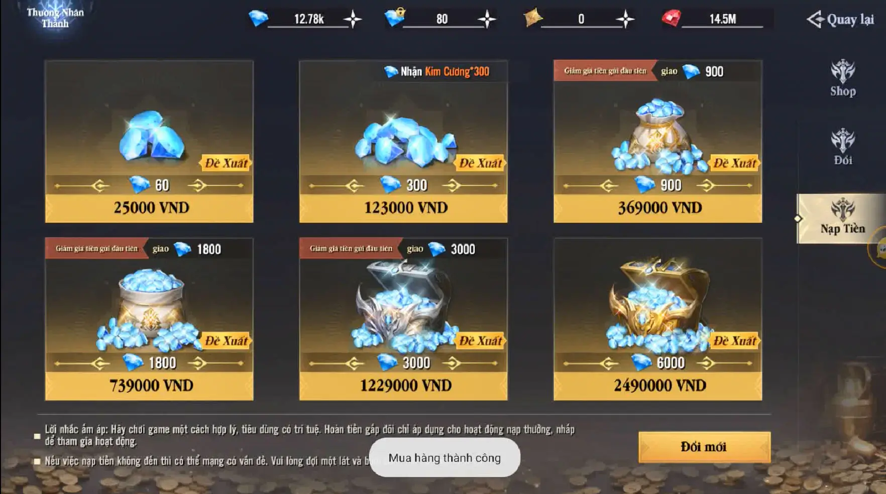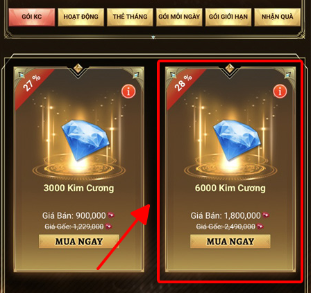 - Với KIM CƯƠNG: khi mua trên Webshop, sẽ được cộng trực tiếp vào kim cương trong game