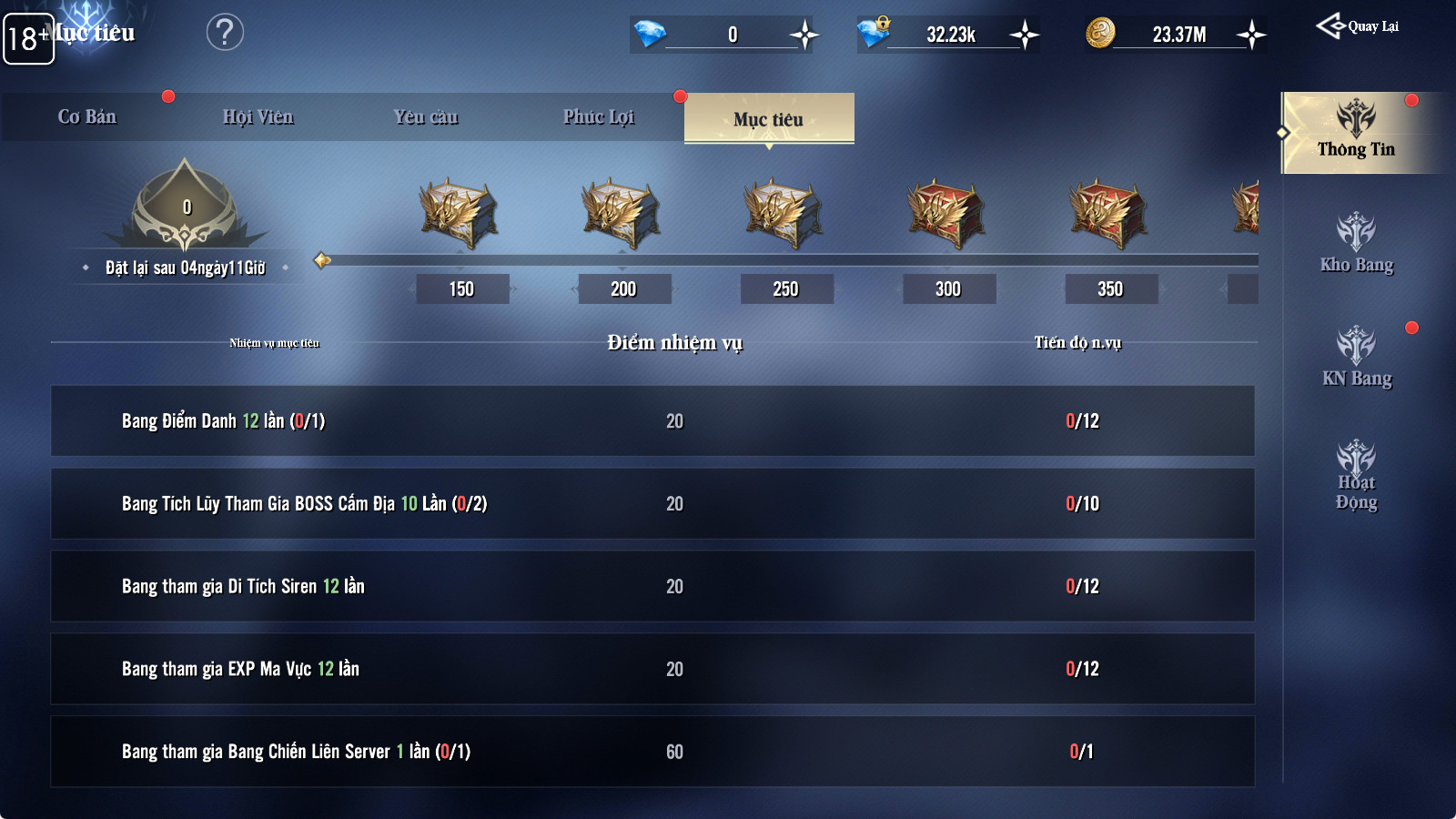 - 04:00 mỗi ngày làm mới số lần làm nhiệm vụ của cá nhân