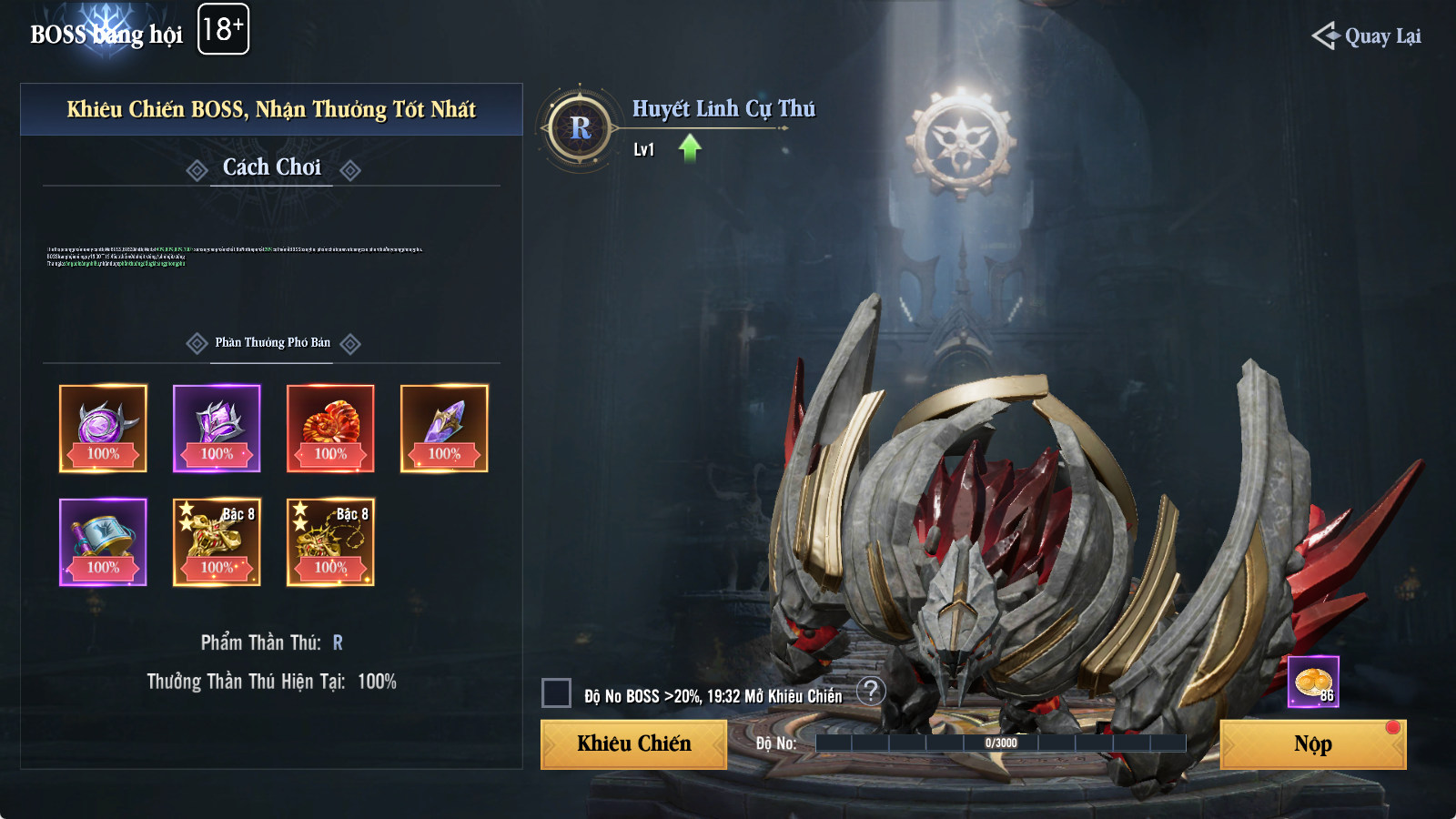 - Khiêu chiến BOSS thành công sẽ dựa vào phẩm chất BOSS và thứ hạng cá nhân để phát thưởng cá nhân.