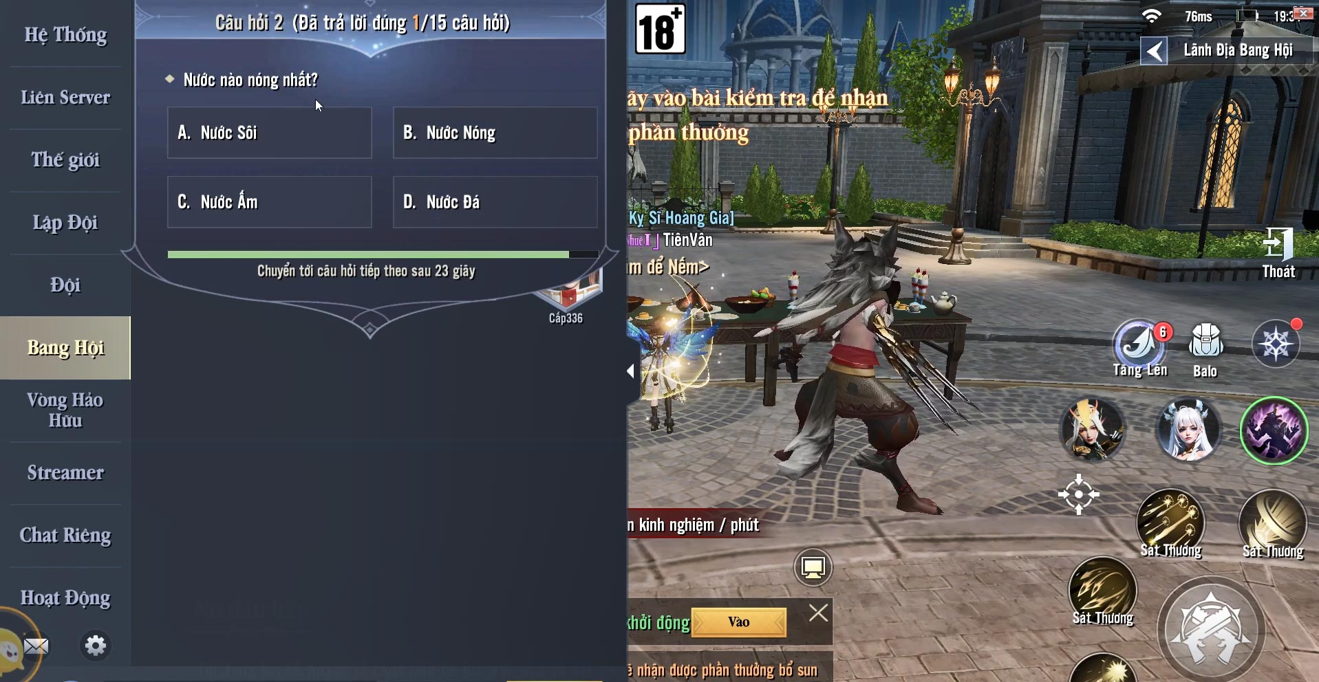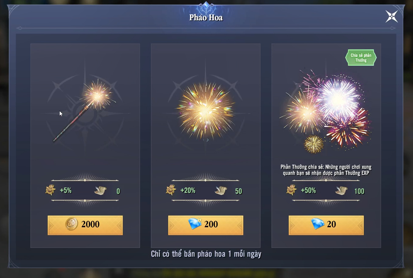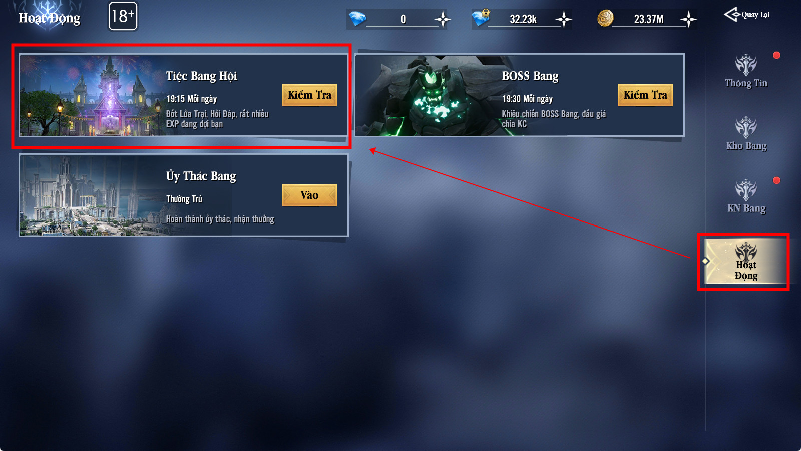 - 19:15 mỗi ngày, tham gia Tiệc Bang Hội với các hoạt động: Đốt Lửa Trại, Hỏi Đáp để nhận thêm EXP và Cống Hiến Bang Hội.