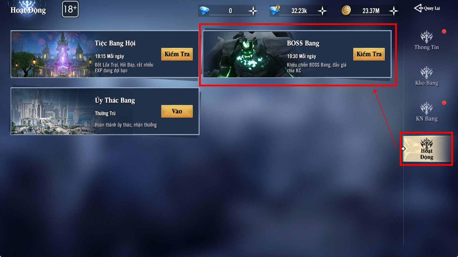 - BOSS Bang chỉ có thể do Hội Trưởng/Phó Hội Trưởng mở ra vào 19:30 - 19:45 mỗi ngày.