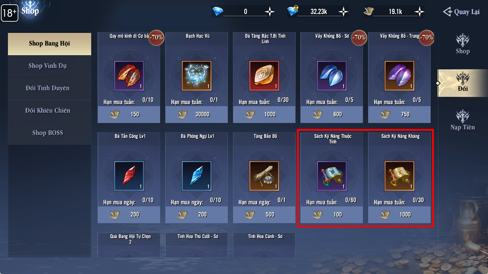 - Thông qua Shop Bang Hội, người chơi có thể đổi: Sách Kỹ Năng Thuộc Tính và Sách Kỹ Năng Kháng.