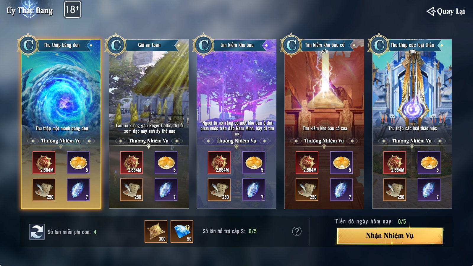 - Người chơi tối đa chỉ có thể hoàn thành 5 lần nhiệm vụ ủy thác. 04:00 mỗi ngày reset nhiệm vụ.
