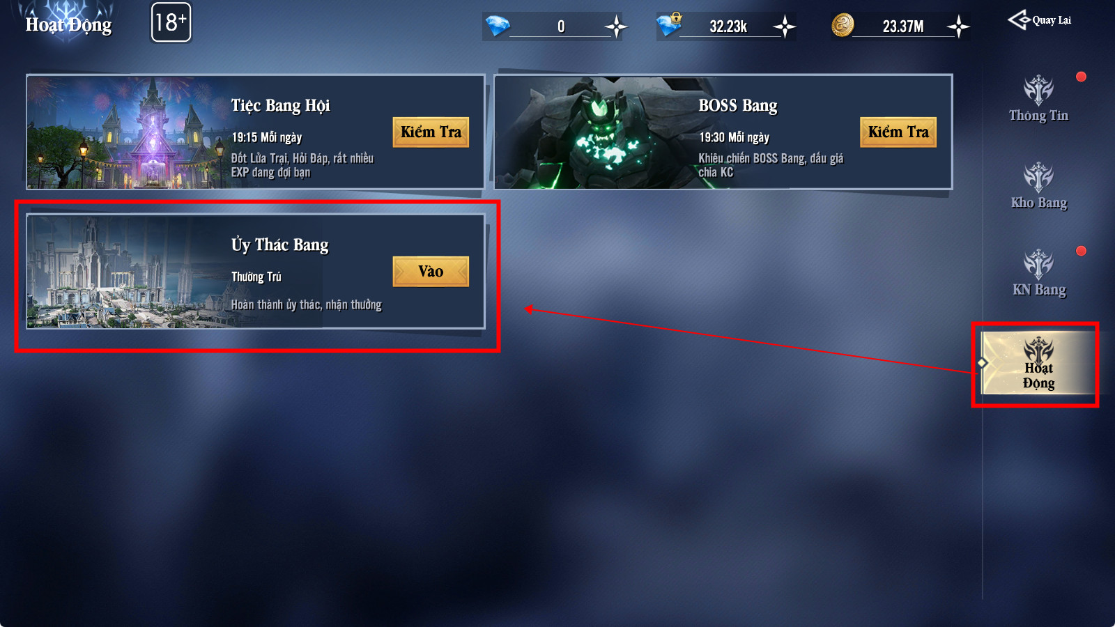 - Mỗi ngày, hoàn thành Ủy Thác Bang Hội để nhận thưởng EXP, Cống Phẩm, Cống Hiến Bang Hội và các vật phẩm khác.