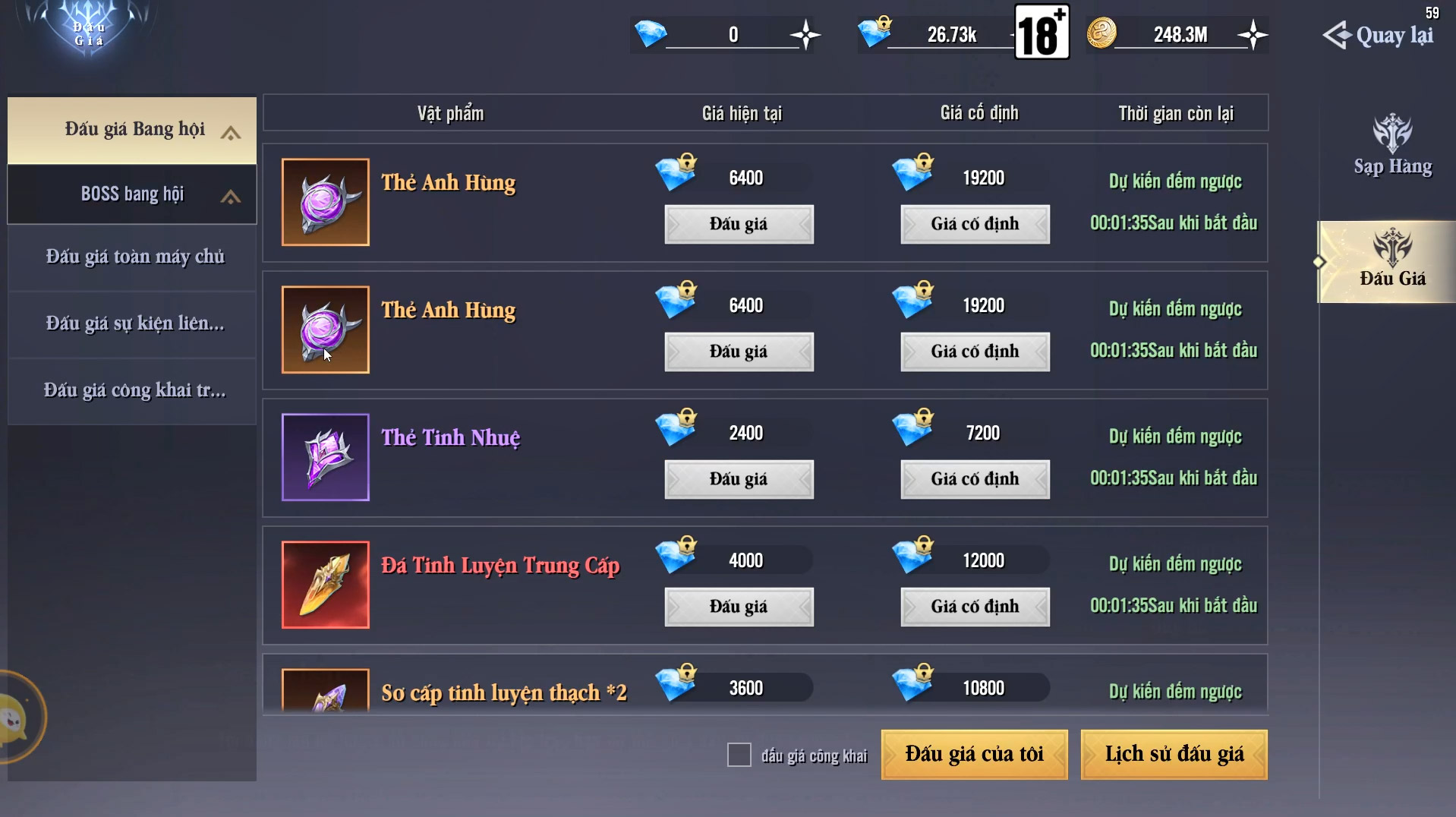 - Khiêu chiến BOSS thành công mở Đấu Giá. Càng nhiều người tham dự, thưởng càng phong phú.
