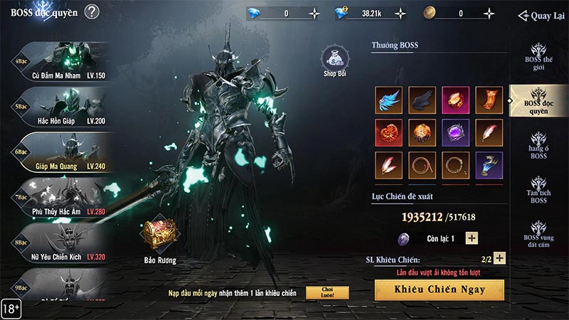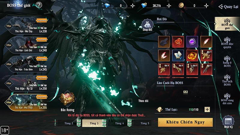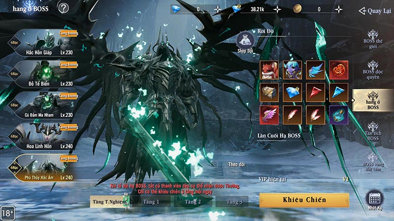 - Không giới hạn số lượt khiêu chiến, nhưng mỗi ngày chỉ có thể vào 3 tầng BOSS.