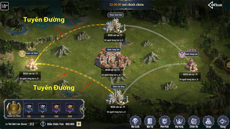 - Trong server: lấy Bang Hội làm đơn vị, chia thành 3 phe.