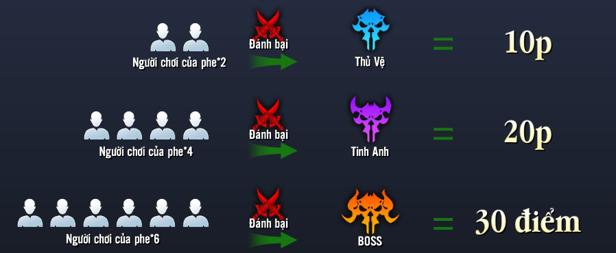 - Nếu số điểm đều bằng nhau sẽ dựa trên phe nào giết được BOSS. Nếu đều không giết được BOSS sẽ dựa trên số lượng quái Tinh Anh. Nếu số lượng quái Tinh Anh như nhau sẽ dựa trên thời gian đạt được điểm tích lũy để quyết định.