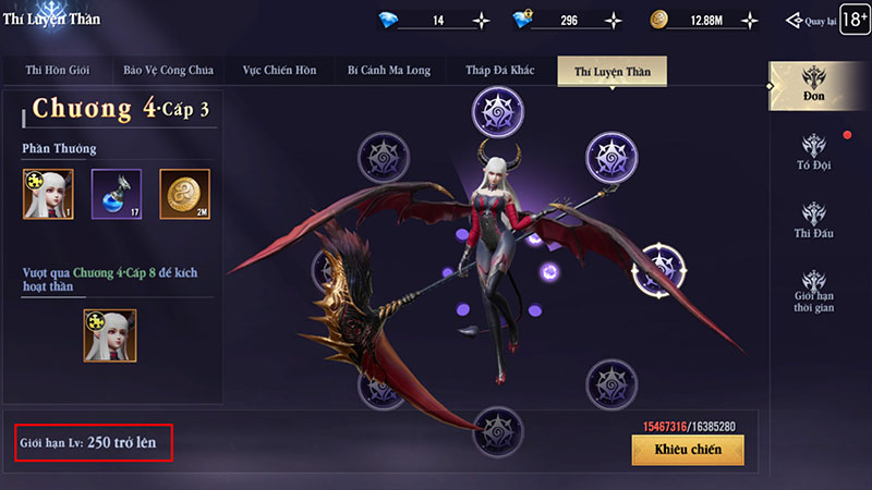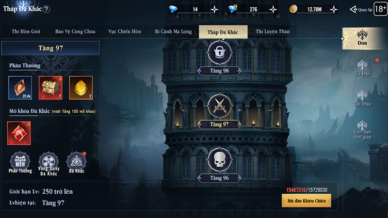 - Mỗi tầng phải đạt yêu cầu Level tương ứng thì mới có thể vào khiêu chiến;