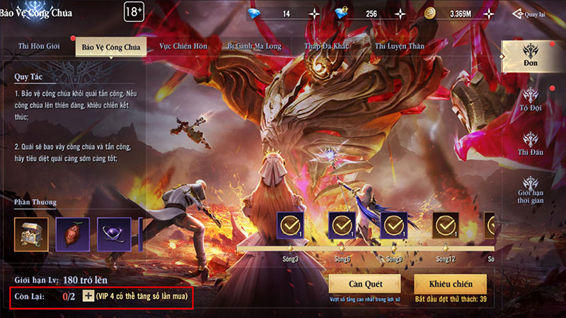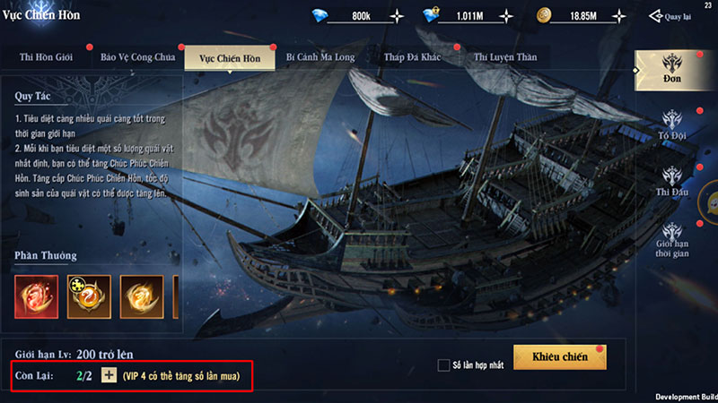 - Mỗi ngày có 2 lượt miễn phí khiêu chiến, Tăng cấp VIP để mua thêm lượt khiêu chiến