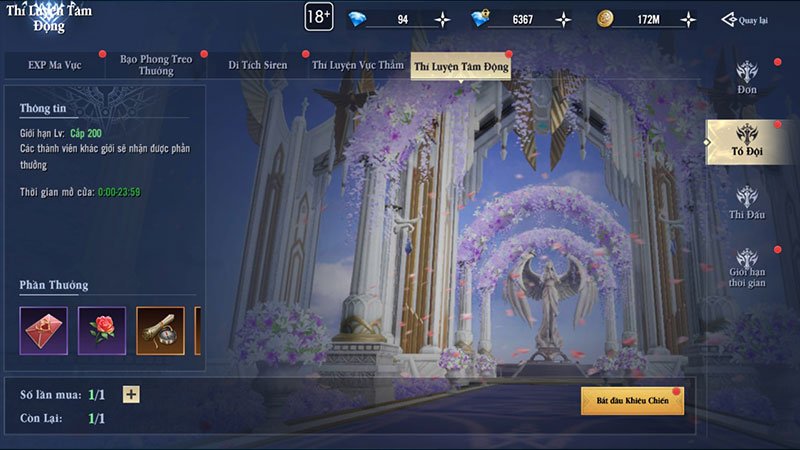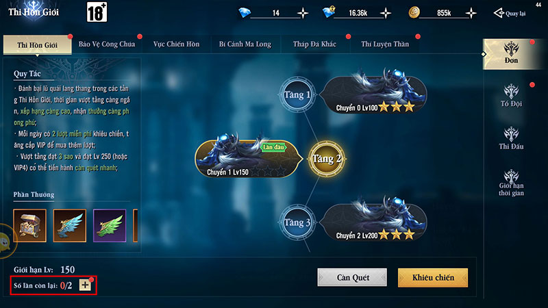 - Mỗi ngày được 1 lần Miễn Phí, và reset mỗi ngày, có thể mua lượt khiêu chiến bằng Kim Cương Khóa
