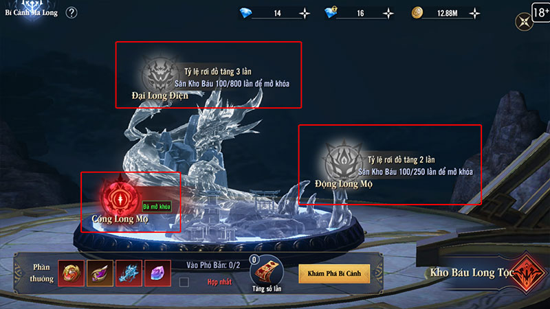 - Trong thời gian mở hoạt động Kho Báu Long Tộc, người chơi có thể thông qua Bí Cảnh Ma Long rơi Chìa Khóa Ma Long (dùng để tầm bảo)