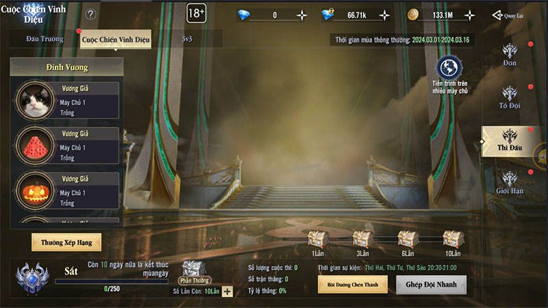 2. Quá trình ghép đội sẽ dựa trên cấp độ và lực chiến của người chơi, cấp độ và lực chiến càng cao thì đối thủ ghép được càng mạnh.