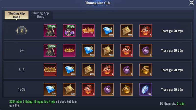 3 .Khi mùa giải kết thúc, căn cứ vào xếp hạng mùa giải và bậc chiến đội hiện tại của chiến đội để tiến hành phát thưởng BXH (để nhận thưởng BXH cần đạt điều kiện tối thiểu của phần thưởng tương ứng).
